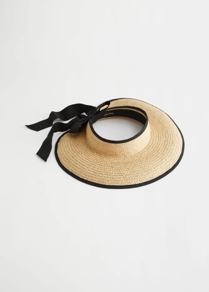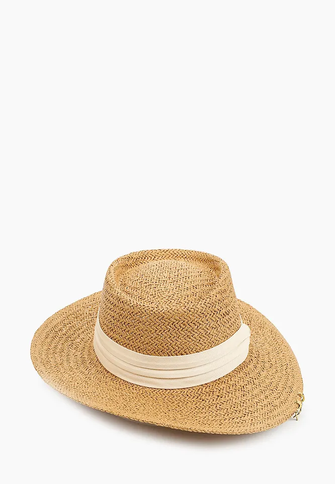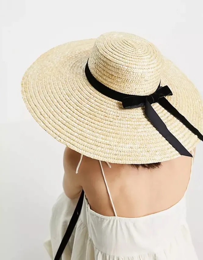Также присмотрись к шляпам-козырькам. В нашей подборке ты найдешь модель с широкими полями и черными лентами, которые завязываются в романтичный бантик, делающий образ легким и женственным.
