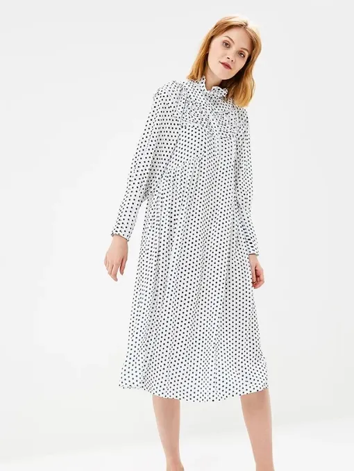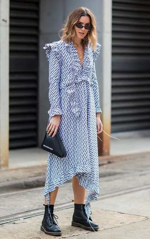 А оверсайз-платье с оборками и асимметричным краем — самая подходящая модель для того, чтобы сочетать ее с ботинками на шнуровке, узкими очками и крупными серьгами-кольцами.