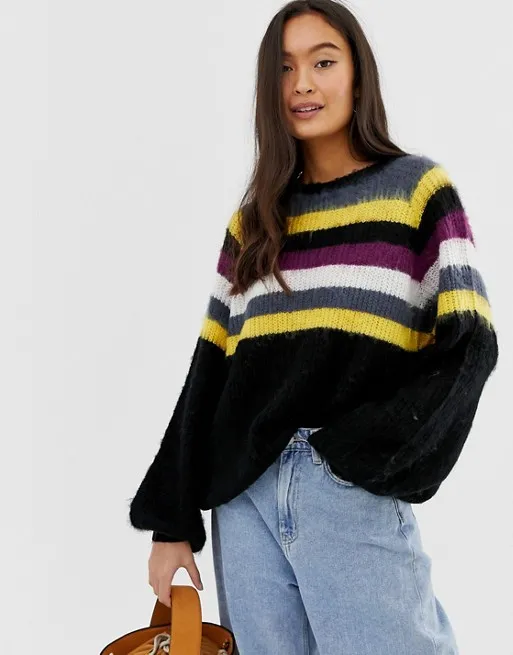 Нам очень нравится дизайн этой модели. С одной стороны, основной цвет материала — черный, а значит, проблемы с подбором низа к этому джемперу у тебя не возникнет. С другой – разноцветные полоски делают его ярким, заметным, благодаря чему он вполне может взять на себя роль акцента в образе.