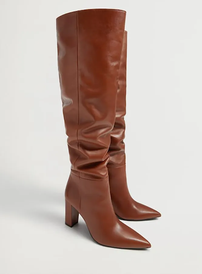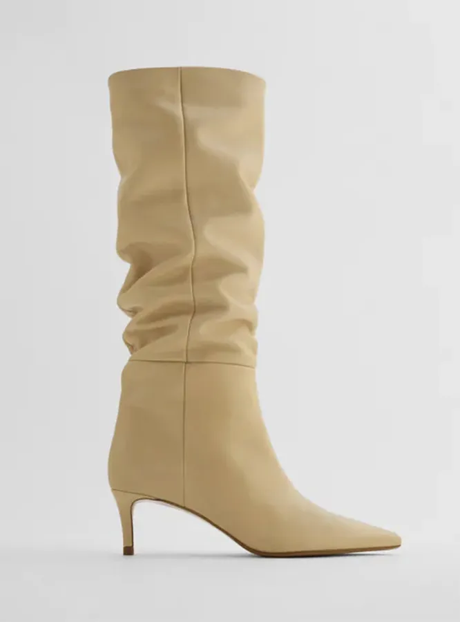 Сделать твой осенний образ мягче и уютнее помогут сапоги с присборенным голенищем. Модницы носят их как с юбками и платьями, так и с джинсами и брюками, заправив штанины внутрь. Здесь действует то же правило, что и в пункте про сапоги-трубы — главное, чтобы они были достаточно просторными и тебе не пришлось бы впихивать в них брючины с силой.