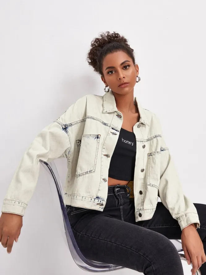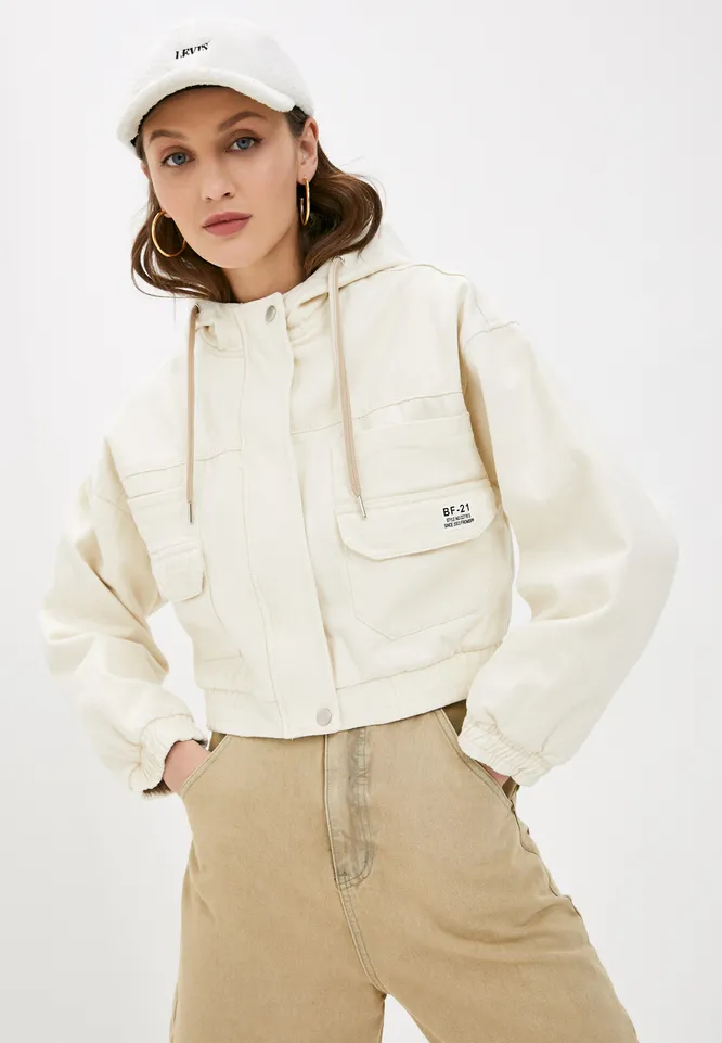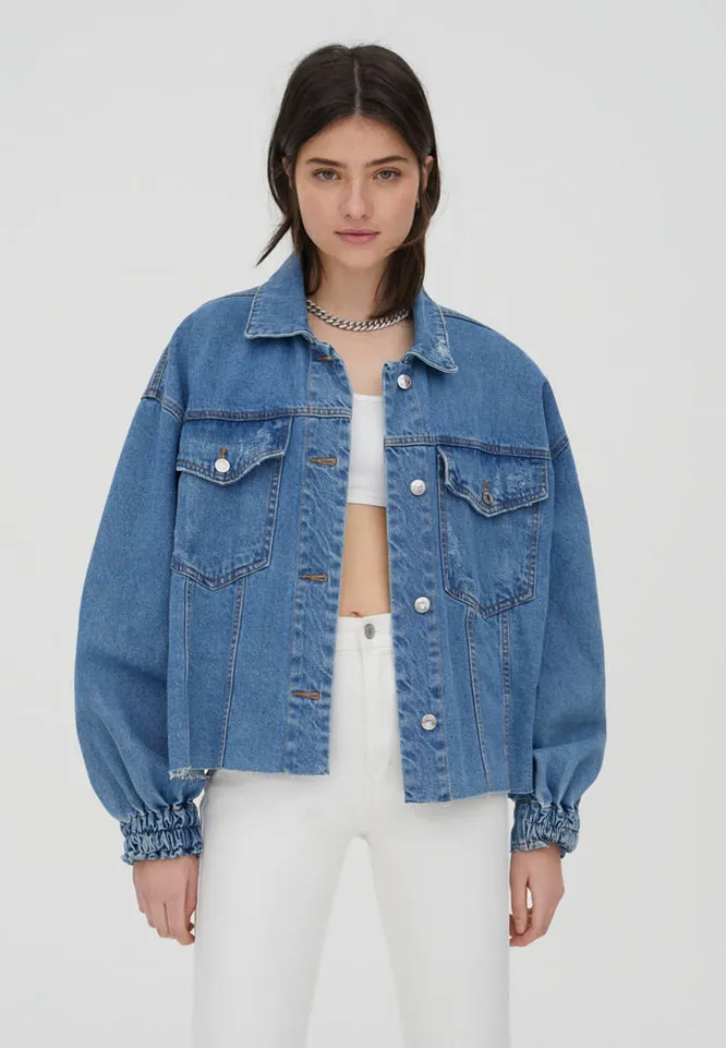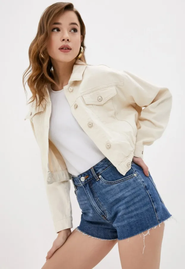 Альтернатива жакету — короткая кремовая джинсовка с объемными рукавами. Сочетай ее с брюками-бананами на высокой посадке, плиссированной юбкой и платьем по фигуре.