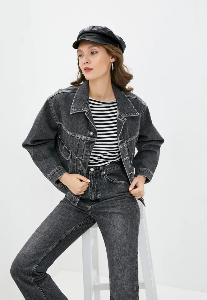 Еще один универсальный вариант — черная куртка из денима. Предлагаем носить ее с кожаными брюками, тельняшкой, ботинками на шнуровке или минималистичными лоферами.