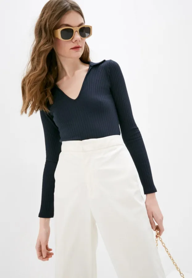 Лонгслив с V-образным вырезом в рубчик можно носить как соло, так и в тандеме с классическим жилетом и пиджаком.