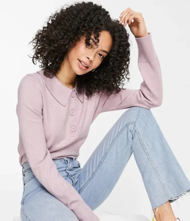 Лавандовый джемпер на пуговицах предлагаем носить с широкими или расклешенными джинсами и кроссовками. Поверх можно надеть оверсайз-кардиган.