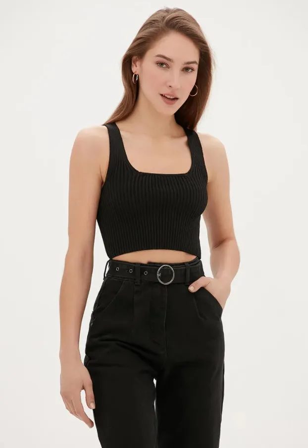 Дизайнеры предлагают этой весной нам носить под кардиган и строгий пиджак укороченный топ. Универсальный вариант — черный топ в рубчик.