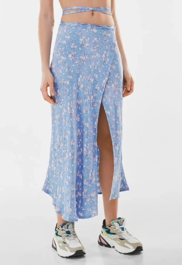 Летящая голубая юбка с разрезом и завязками на талии — мастхэв летнего гардероба. Можно носить ее на пляж или в городе с укороченным топом и босоножками.