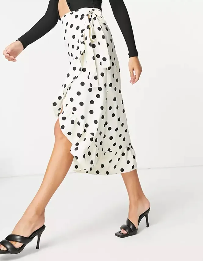 Юбка в горох с оборками отлично смотрится с красной блузкой и лодочками, базовой водолазкой и туфлями «мэри джейн».