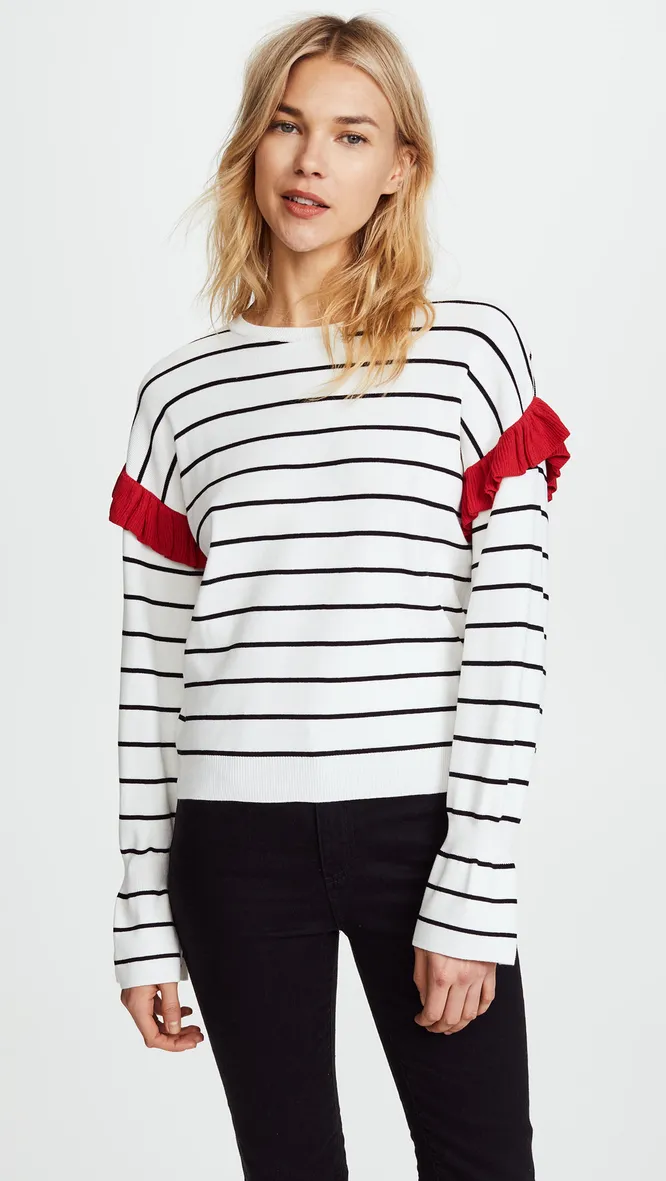 Морской стиль плюс романтичные воланы на рукавах — эта тельняшка подойдет тебе, если ты неравнодушна к романтическому стилю.