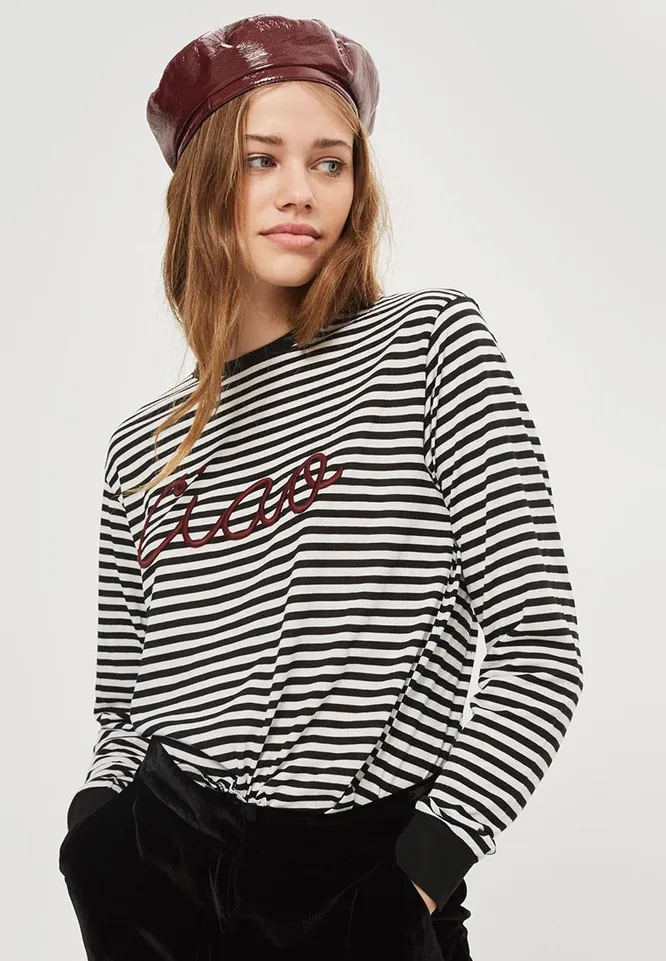 Эта тельняшка с неброской надписью безупречно впишется в образ в парижском стиле — добавь к ней черные скинни, кожаный берет и лоферы с острым носом.