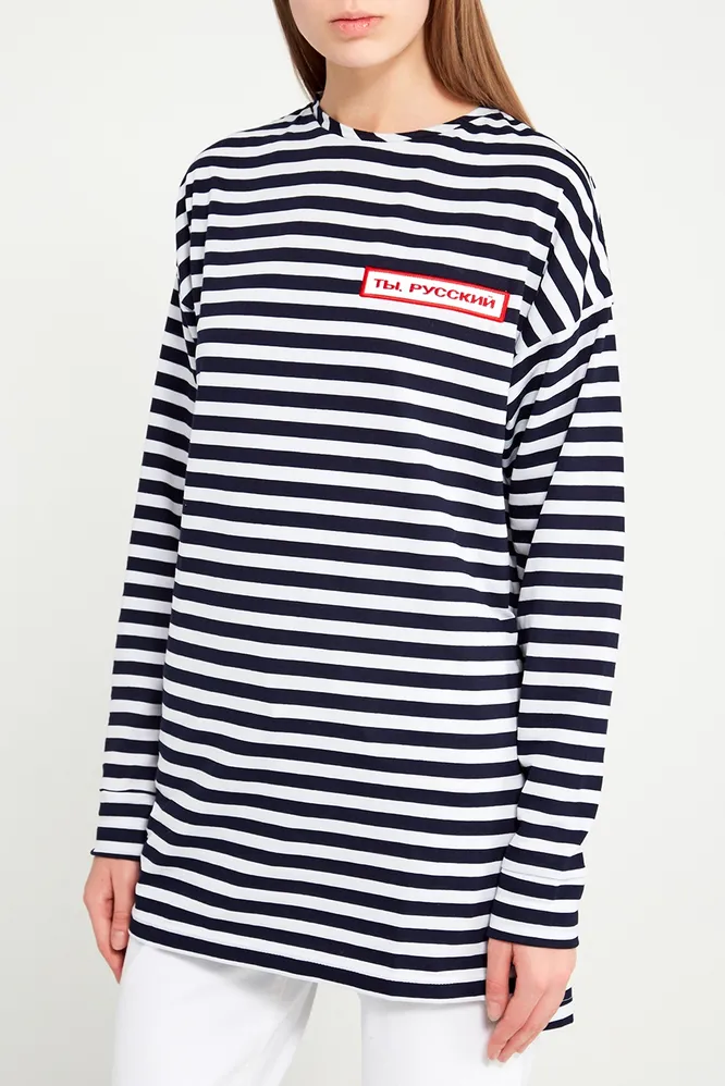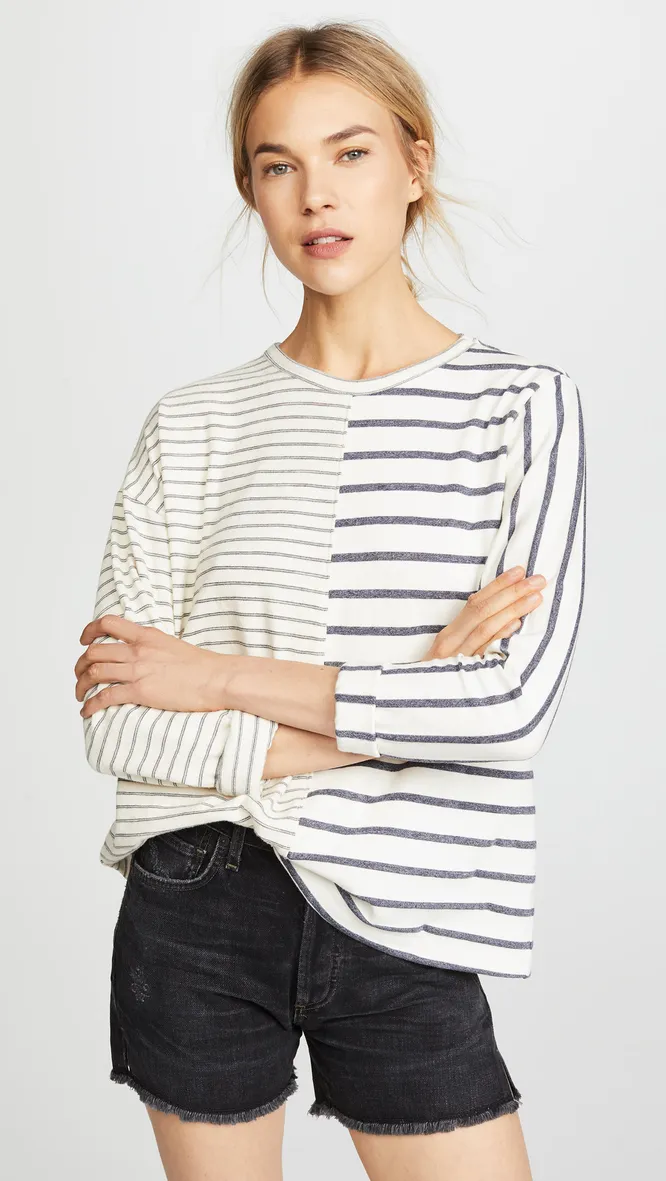 А эта модель буквально объединяет две разных тельняшки в одной — идеальная покупка для поклонниц оригинальных вещей.