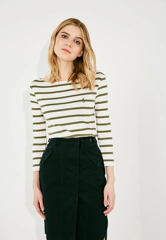 Традиционно тельняшки бывают черно-белые, красно-белые и сине-белые. Поэтому эта модель в полоску цвета хаки удачно разнообразит твой гардероб и заодно подружится с любым низом, от mom jeans до юбки-карандаша.