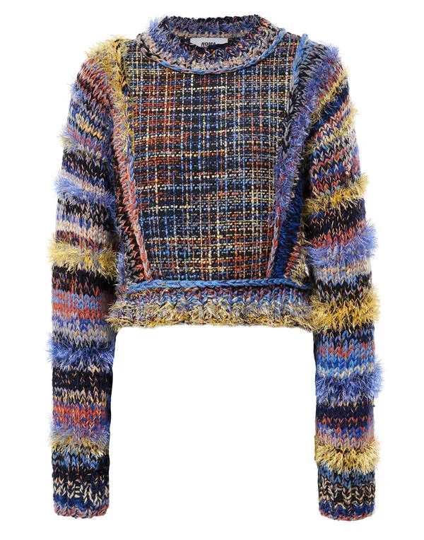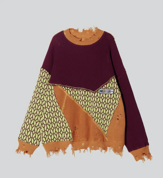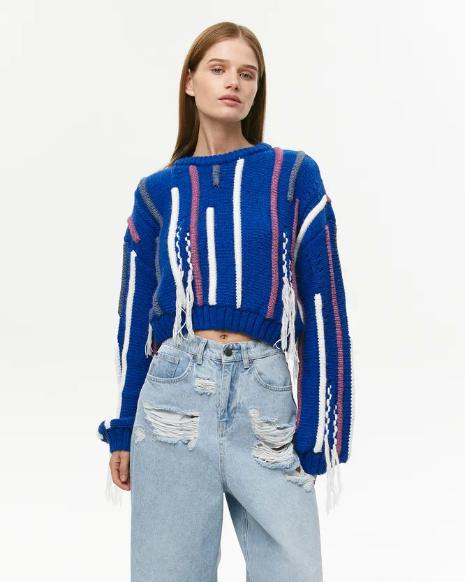 Под «попугайным» мы имеем в виду свитеры и джемперы с крупными аппликациями, притягивающими внимание декоративными элементами, модели, выполненные из разных лоскутов — то есть в технике пэчворк. Бахрома, косички из ниток, рваные края, замысловатые узоры, насыщенный колорблок, пушистые рукава — заверните, берем все!