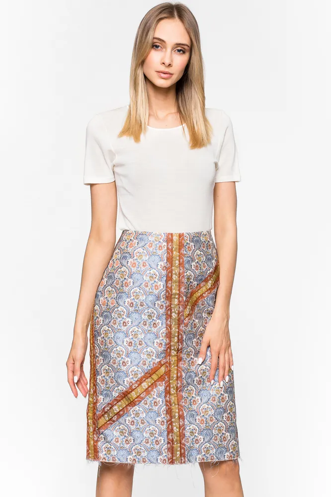 И еще одна модель-акцент для модниц, которые не боятся экспериментировать со стилем — пусть тебя не пугает «обойный» принт, благодаря ему эта юбка подружится как с базовой футболкой и классическими «лодочками», так и с необычным верхом или обувью.