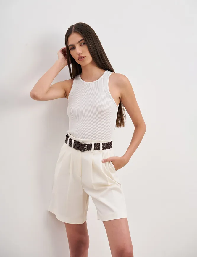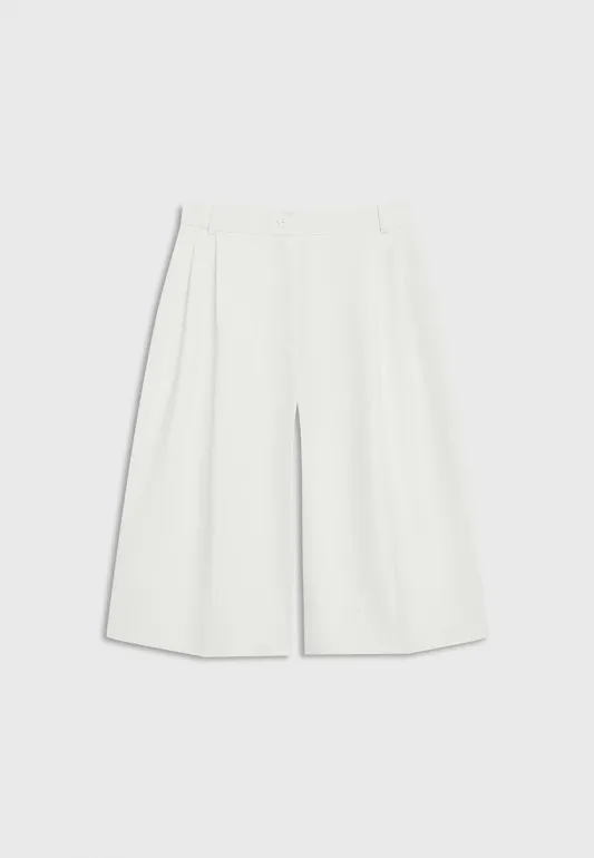 В первую очередь такие шорты хороши плотной костюмной тканью: она держит форму и поэтому немного корректирует силуэт. Плюс, обычно костюмные модели не грешат плохой, невнятной длиной, так что носить их можно и в 20, и в 30, и в 40. Идеальными, конечно, будут бермуды: достаточно широкие, свободные, но плотно сидящие на бедрах и отлично подходящие к летним жакетам.