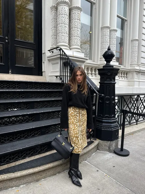 Если ты осторожна в экспериментах, то начни с аксессуаров. Например, добавь к шоколадному шерстяному пальто накладной меховой воротник с оленьим принтом, сумку-тоут или ботильоны. Даже с базовой основой образ будет смотреться тренди.