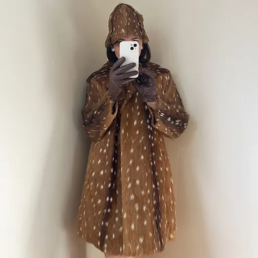 Олений принт особенно хорош там, где есть тактильность, мягкость и теплая текстура. Он отлично работает на верхней одежде — куртки, шубки, пальто. Либо в качестве акцента на воротнике, меховых манжетах и шапках.