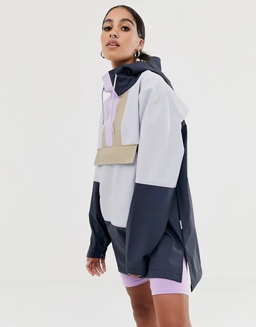 Дождевик в стиле королблок подружится с синими джинсами и яркими велосипедками. Для прогулки подбери к наряду массивные кроссовки необычной расцветки, а для похода на вечеринку — босоножки на тонких ремешках с эффектом металлик.