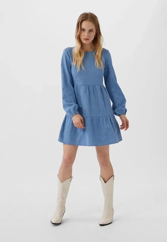 Такое платье пригодится тебе не только весной, но и жарким летом: в этом году особенно модно носить модели с пышными рукавами и ярусами. Лучшую компанию ему составят высокие казаки нейтрального оттенка и сумка с ремешком через плечо. В качестве верха выбирай байкерскую куртку с мужского плеча, которая может быть как в тон обуви, так и контрастировать с ней.