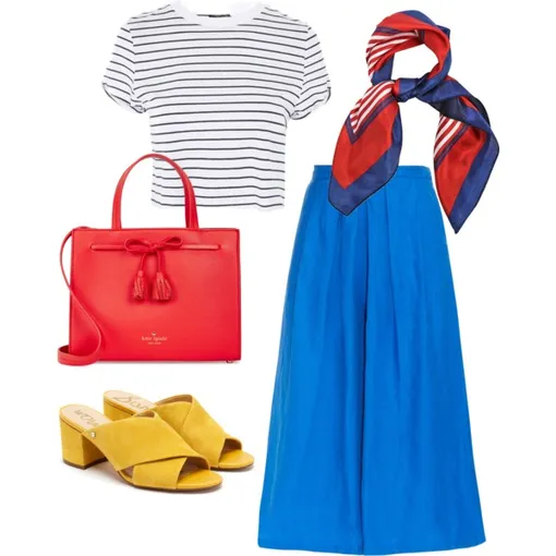 Топ в бретонскую полоску или просто матроска – мастхэв летнего гардероба вот уже более ста лет! С легкой руки мадемуазель Шанель самые передовые модницы Довиля уже в 1917 году носили матроску на пляж. Теперь мы смело надеваем полосатую кофту и в бар, и в ресторан, и даже в театр, главное – подобрать к ней верные аксессуары. Наш вариант – матроска в сочетании с широкими брюками, желтыми мюлями или сандалиями (уловили связь с образом Дака?) и романтичным платком – идеально подойдет для выходного дня в городе.