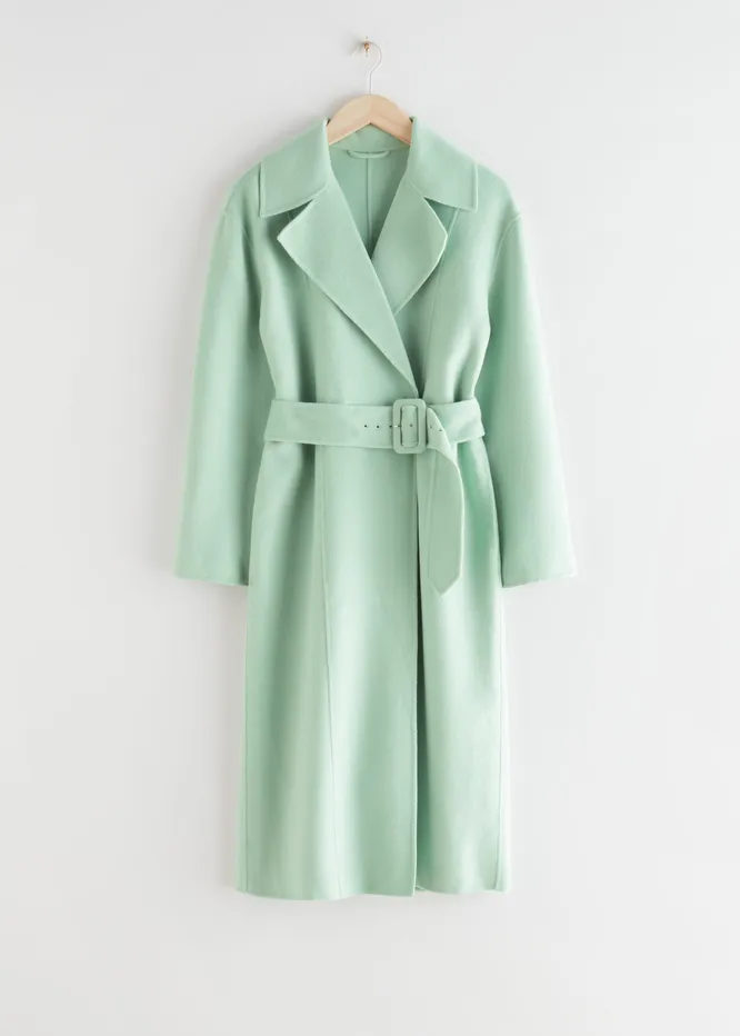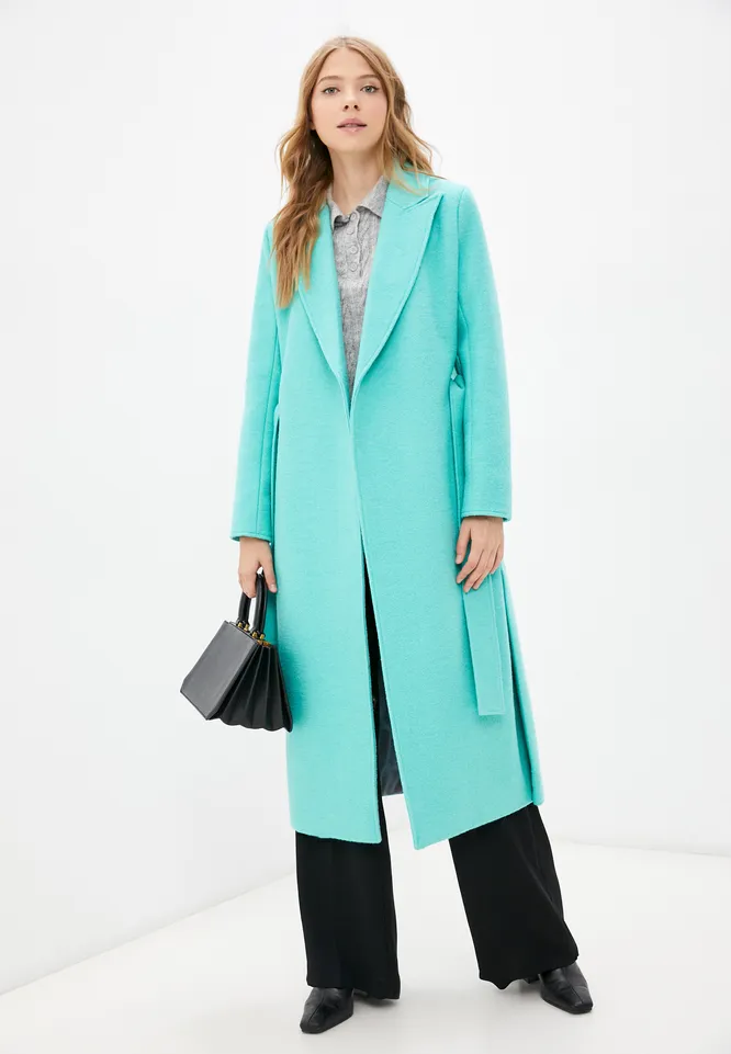 Пальто в оттенке Тиффани придётся по вкусу истинным романтикам. Оно будет отлично смотреть с синими джинсами-мом и стильными белыми казаками.