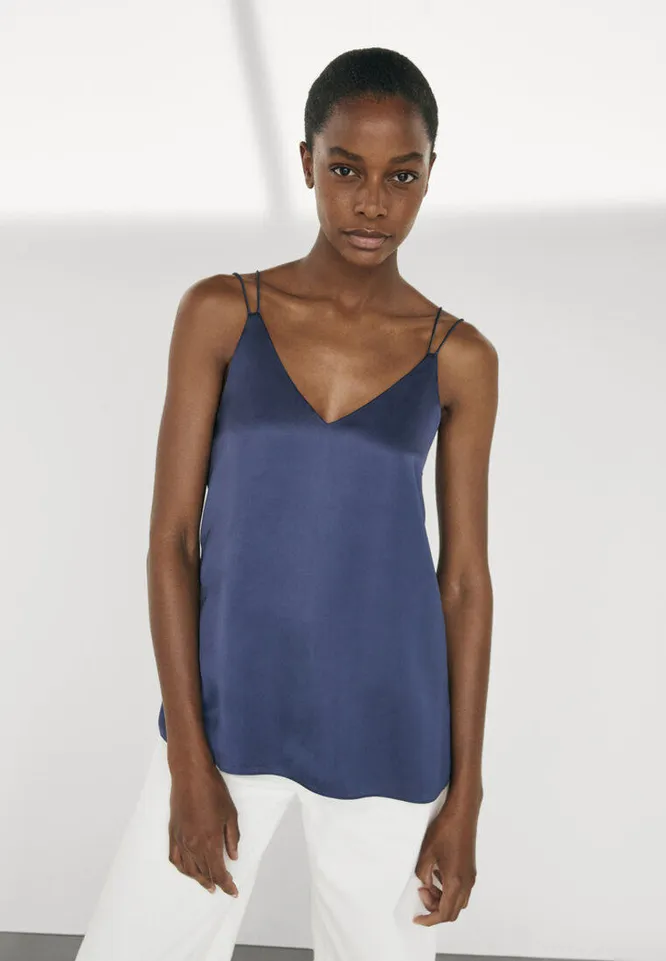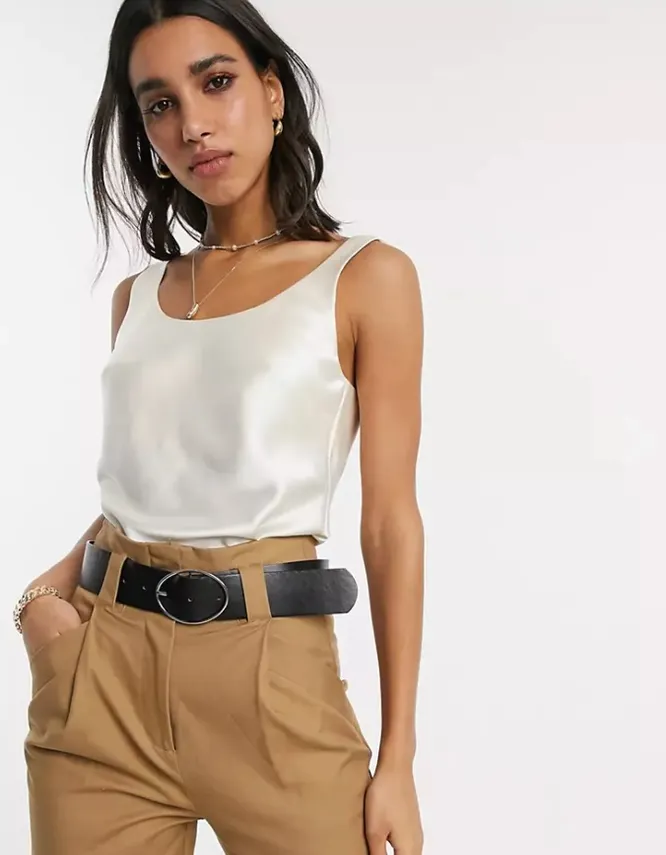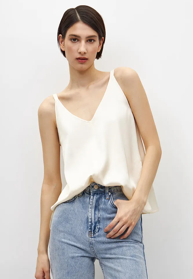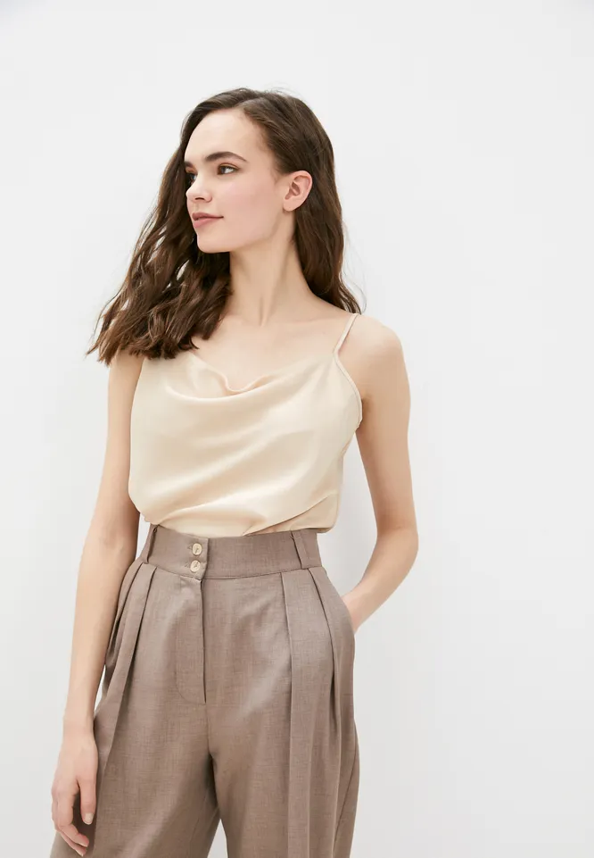 Шелковистый топ в бельевом стиле – универсальная базовая вещь, которая легко вписывается и в повседневные, и в деловые, и в вечерние образы. Помимо классических моделей с тонкими бретельками и треугольным вырезом актуальны и атласные майки, топы с плиссировкой или драпировкой.