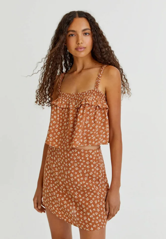 В этом сезоне корсетные топы стали настоящим мастхэвом. Идеальный вариант на лето — топ с цветочным принтом. Квадратный вырез и рукава-фонарики добавят образу нежность и легкость.