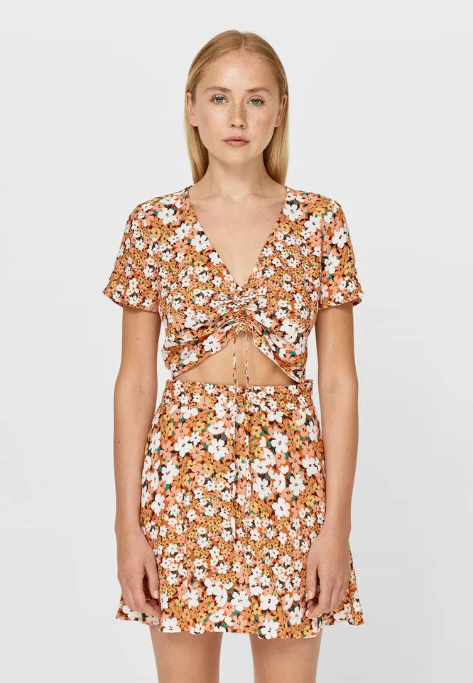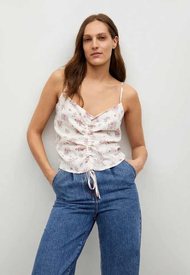 Подчеркнуть талию и удлинить шею поможет кроп-топ со сборками на груди.