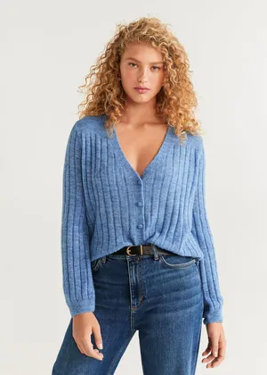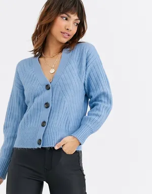 Открывает нашу подборку небесно-синий кардиган в рубчик с глубоким V-образным вырезом. Предлагаем носить эту модель на голое тело, сочетая с джинсами, брюками или юбками с высокой посадкой. Благодаря тонкому материалу, ты сможешь легко заправить его за пояс, тем самым подчеркнув талию.