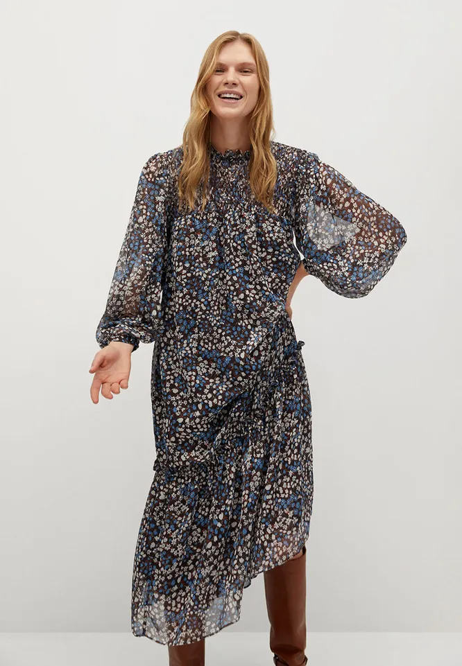Длинные воздушные рукава, свободный силуэт, мелкий цветочный принт – все это делает это платье макси невероятно женственным. Оно достаточно нейтральное, поэтому его можно носить как с массивными городскими кроссовками, так и с красивыми остроносыми сапогами и ботфортами на каблуке. Сделать образ более собранным и завершенным помогут акцентные серьги и сумка необычной геометрической формы (например, сейчас на пике популярности модели в форме полумесяца).