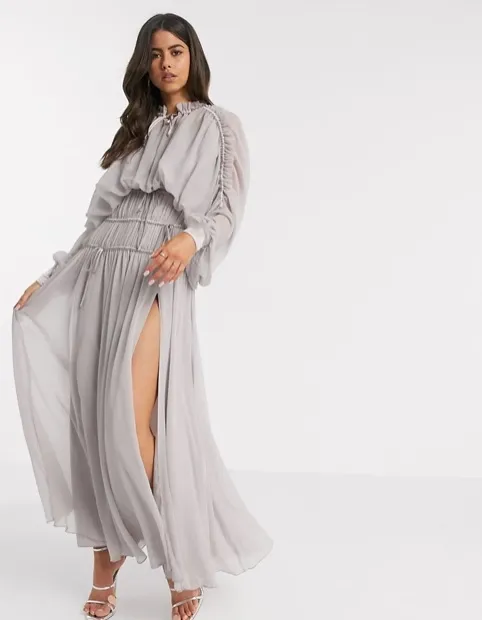 Это платье даст тебе все шансы стать звездой любого вечера. Сборки, мелкие рюши, ниспадающий силуэт и длинные вырезы на подоле, пыльный лавандовый цвет – все это делает данное платье невероятно нежным, женственным и воздушным. С аксессуарами мудрить не стоит: аккуратного клатча и мерцающих сережек будет достаточно.
