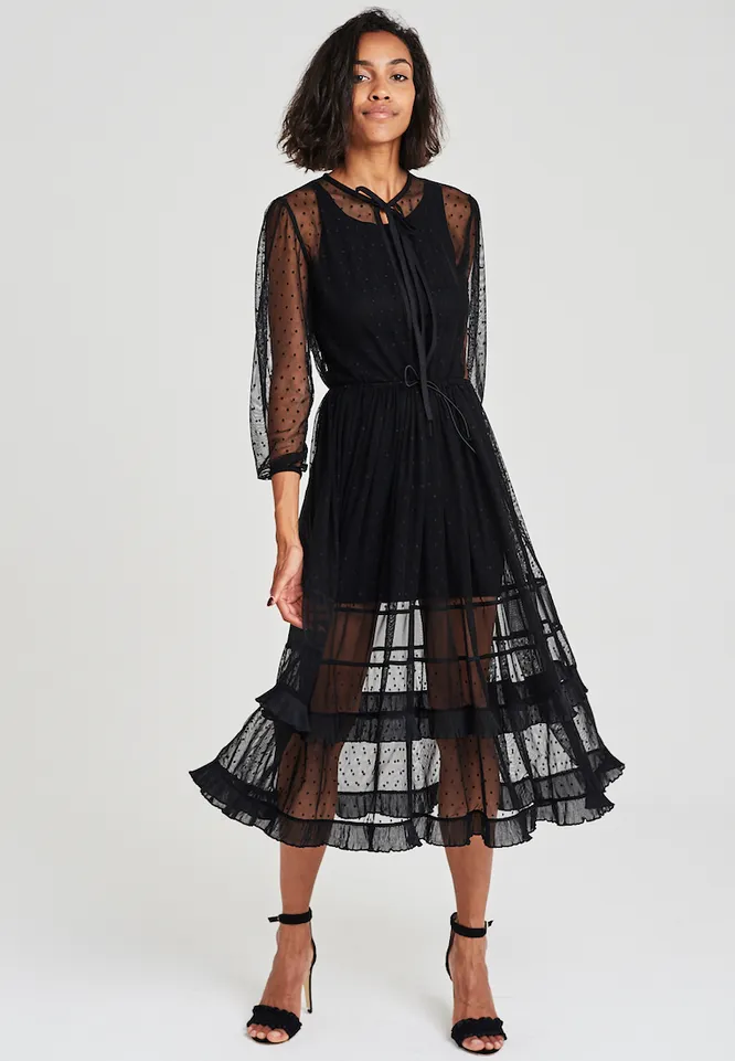Немного дерзкое, но в то же время элегантное черное платье из шифона отлично смотрится с обувью и аксессуарами серебристого цвета. Достойную партию ему составят туфли «мэри джейн» и небольшая сумочка.