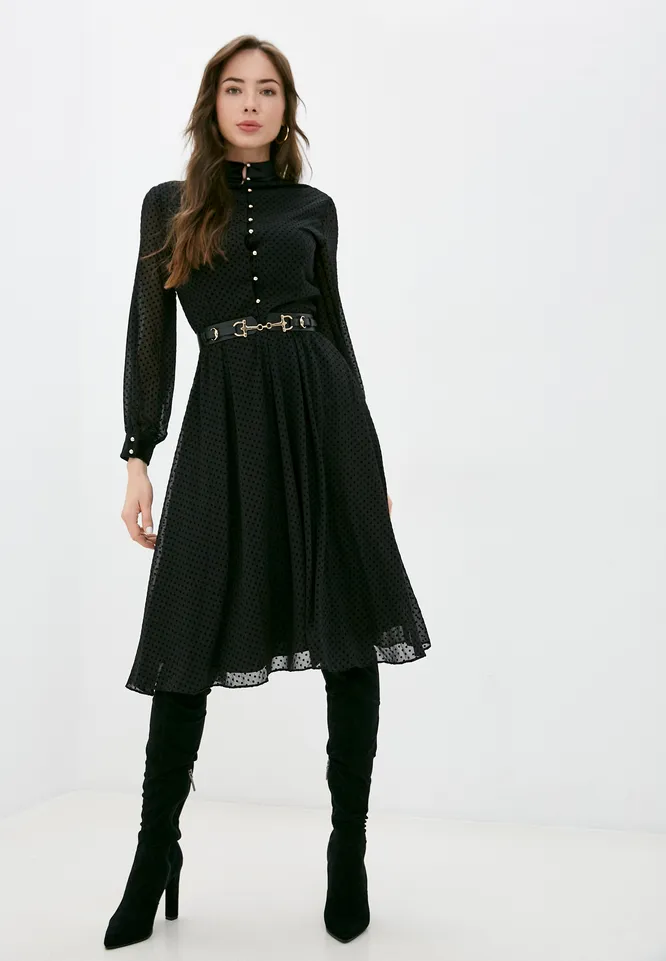 Ничто так не льстит женской фигуре, как платье с запахом. Наш выбор – модель из шифона с широкими рукавами и V-образным вырезом, который визуально удлинит шею и подчеркнет ключицы. Дополни его черным кожаным ремнем с акцентной пряжкой или поясом-корсетом. Подходящей парой обуви станут облегающие ботфорты или сапоги-гармошки с каблуком kitten heel.