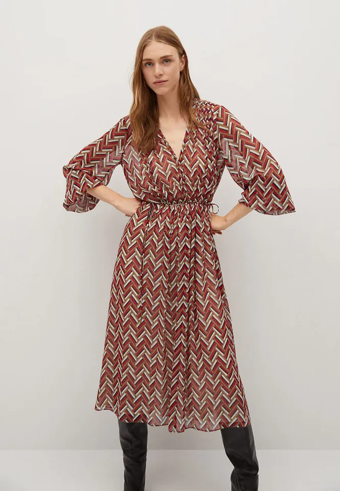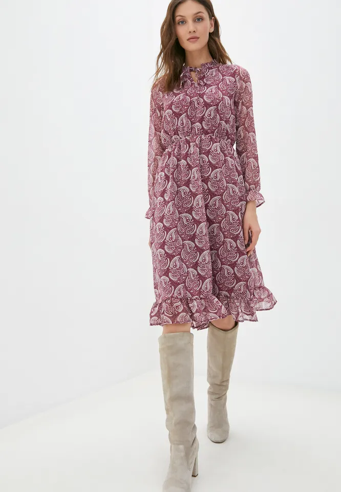 Миди – универсальная длина, которая подходит практически всем девушкам и уместна в разных контекстах. Это платье с пестрым, но в то же время некричащим принтом создаст стильный аутифт в паре со светлой обувью. Это могут быть белые ботильоны, кремовые присборенные сапоги или бежевые ботинки на шнуровке. Подчеркни талию коричневым и бордовым кожаным ремнем и расставь еще несколько ненавязчивых акцентов при помощи украшений и аксессуаров для волос.