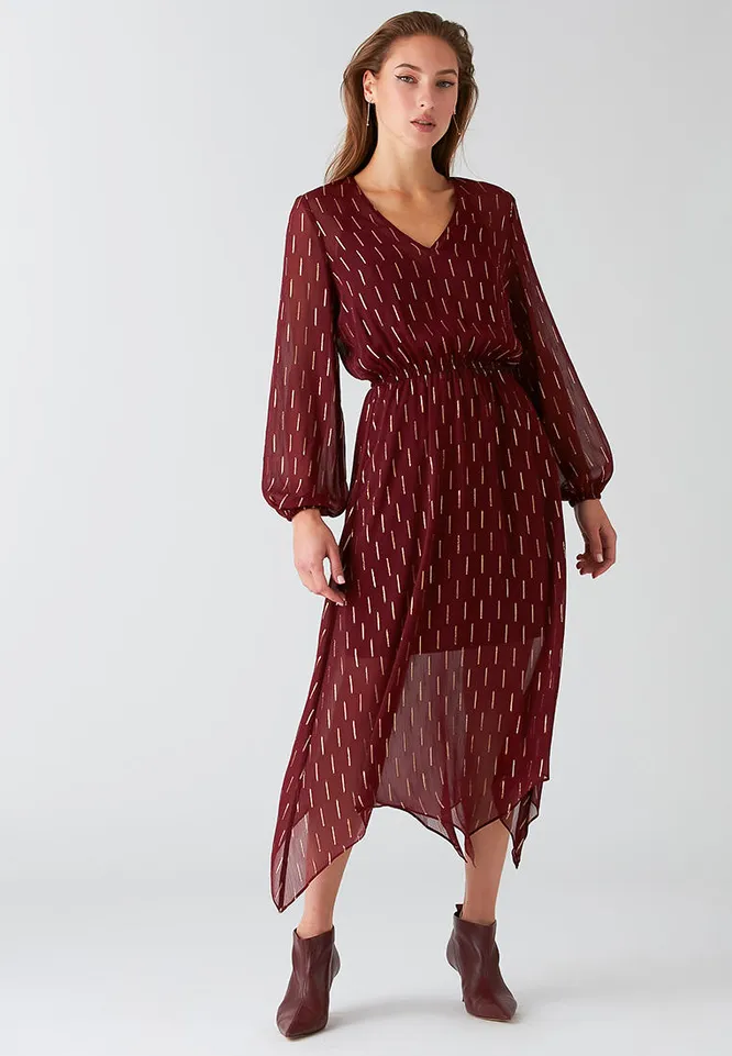 Это шифоновое платье с объемными рукавами насыщенного бордового цвета уместно в контексте любой вечеринки. Носи его с серьгами-люстрами, сумочкой в винтажном стиле и обувью с нарядным, но не аляповатым декором. В повседневной жизни предлагаем его носить с обувью на плоском ходу, а поверх надевать удлиненный свитер оверсайз.