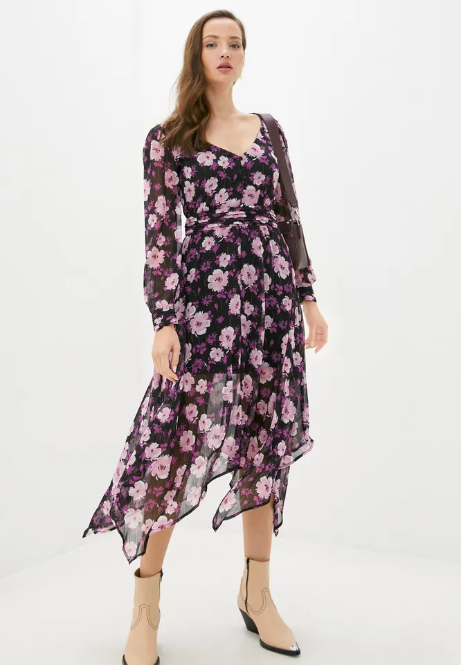 Поклонницам необычного кроя и летящих силуэтов стоит обратить внимание на шифоновые платья с асимметричным подолом. Например, это платье с цветочным принтом хорошо смотрится с аккуратными высокими сапогами и изящными туфлями-лодочками. Удачным завершением наряда станет сумка жесткой формы, широкий ремень на талию и массивное колье. V-образный вырез и зигзагообразный подол визуально вытянут силуэт и сделают тебя выше и стройнее.