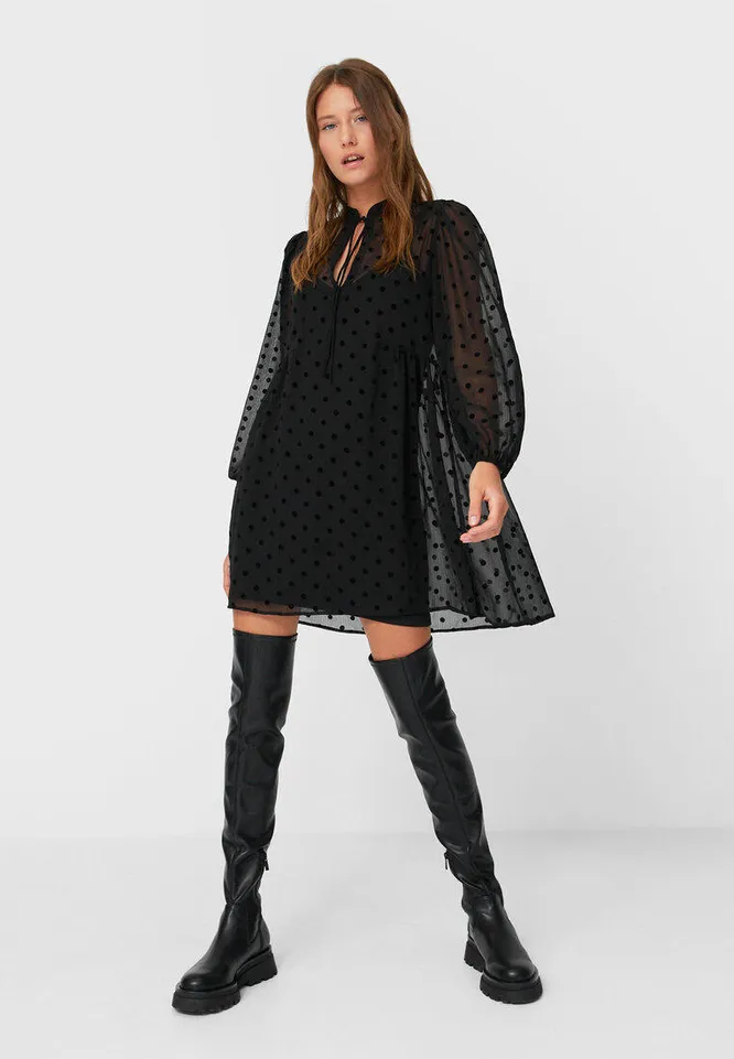 Кокетливое мини-платье с драпировками и объемным шифоновыми рукавами в мелкий горошек – идеальный наряд для любой вечеринки. Дополни его капроновыми колготками в мушку, бархатным клатчем и ботфортами-чулками.