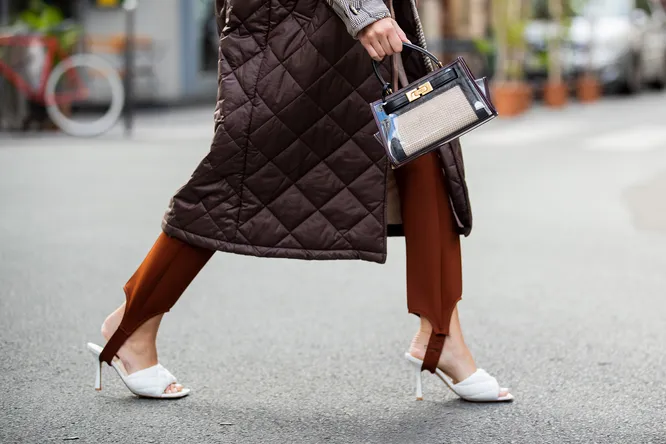 Интересным дополнением к повседневным образам станут белые мюли на блочном каблуке с квадратным мысом. Они помогут структурировать оверсайз-образ, носи их с широкими брюками в пол и свободной рубашкой.