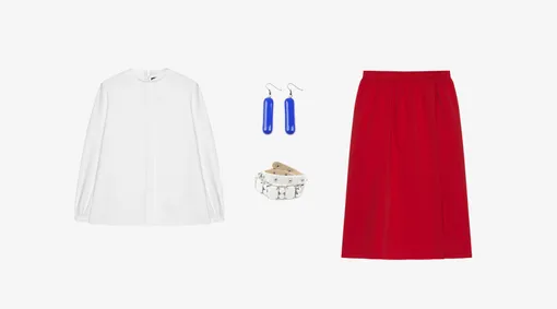 Красная юбка с запахом длины миди – то что нужно на летний сезон: она будет одинаково гармонично смотреться как с топом на тонких бретелях, так и с классической белой рубашкой. Мы советуем расширить горизонты гардероба и выбрать вместо рубашки легкую блузу с актуальными и поныне викторианскими мотивами: объемные рукава и воротник-стоечка еще пригодятся вам осенью. Добавьте к вашему образу туфли-оксфорды или модные в этом сезоне туфли-мюли на плоском ходу. А для самых продвинутых подойдет вариант с сине-белыми украшениями: тренд на триколор – один самых популярных и в то же время сложных, поэтому не слишком усердствуйте с соответствием государственному флагу.