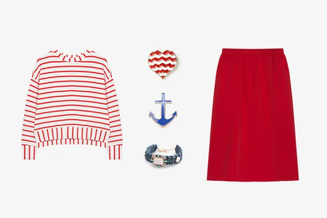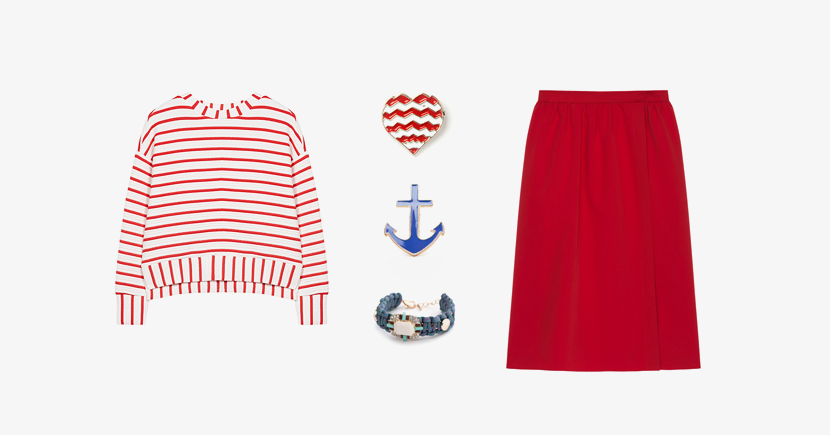 Красный total look гарантирует, что вы будете в центре внимания – парадоксально, но факт. Главное – не переусердствовать и мудро распределить акценты. Однотонная красная юбка – достаточно мощный элемент образа, поэтому верх лучше подобрать не совсем однотонный. Идеальным решением станет принт в полоску – что бы ни происходило в мире, морская тема возвращается каждое лето еще с момента его изобретения. Добавьте еще больше красного, но не пренебрегайте иронией: маленькая деталь в виде значка с похожим принтом, как на свитере, добавит вам баллов к остроумию. А завершить образ поможет снова морская тема – и тут снова выступает триколор – синее кольцо в виде якоря разрушит единство красного, но поспособствует насыщенности образа.