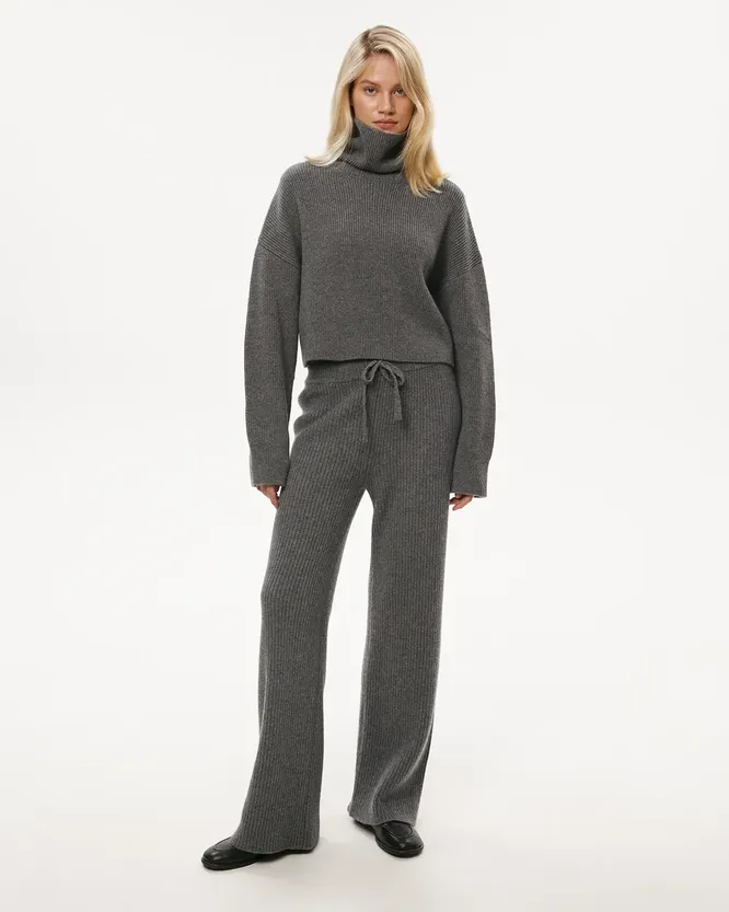 О том, что высокая талия — это тренд, наверное, и говорить нечего. Плюс, это банально удобно: под джемпером, свитшотом или свитером все равно не показать низкую талию (если ты не носишь укороченный верх), так что высокая посадка в трикотажном костюме — ровно то, что нужно на зиму!