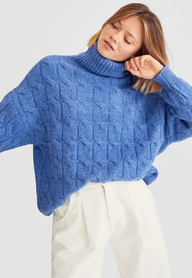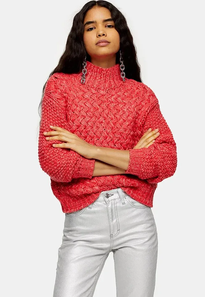 С кожаными брюками, черными рваными джинсами, плиссированной юбкой миди — этот свитер поможет сделать твой образ ярче, куда бы ты не отправлялась. Объемный крой, воротник-стойка, узор-косичка — беспроигрышная формула этой весны.