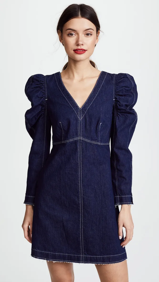В платье из денима с необычными рукавами ты будешь выглядеть очень женственно и мило. Надень его на свидание в комплекте с яркими аксессуарами и босоножками на небольшом каблуке. Чтобы выглядеть еще более изящно, завяжи на шее шелковый платок с принтом.