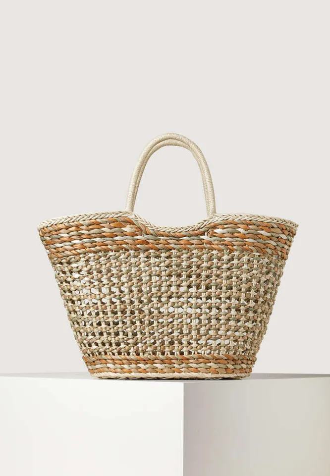 С собой на пляж бери большую плетеную сумку-шопер. В нее поместится всё, что нужно, а твой образ станет завершенным и стильным.
