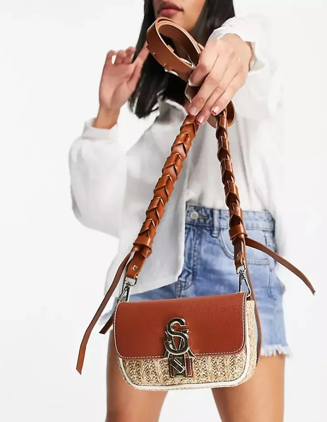 Сделать образ фактурным поможет сумка из соломки с акцентным плетеными ремнем. Модель круто смотрится с рубашкой и джинсовыми шортами, летящим платьем миди, костюмами с бермудами.