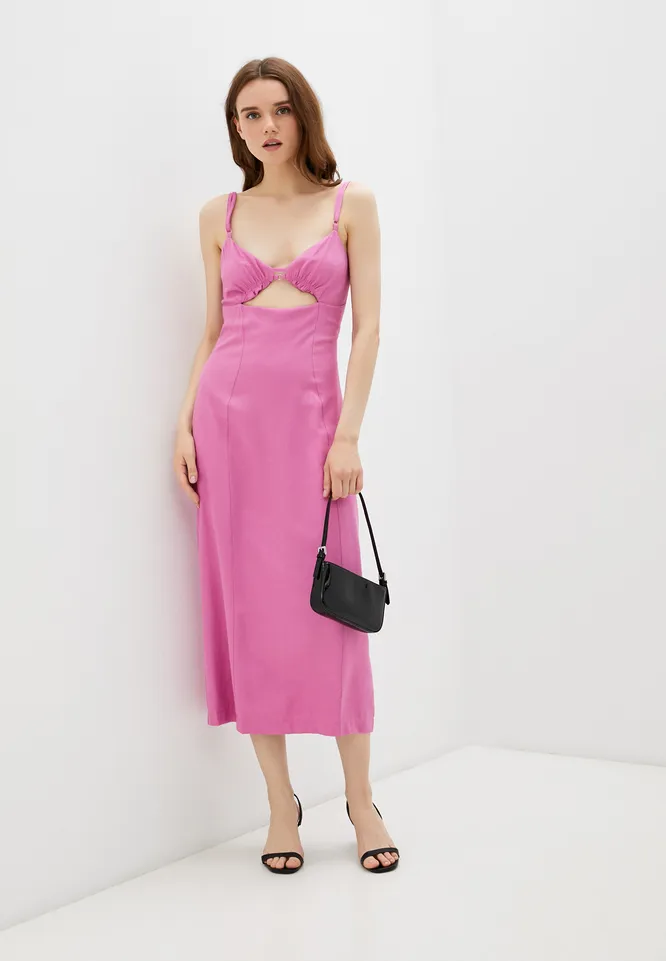 Лаконичное платье с вырезами на талии поможет создать привлекательный лук для вечеринки или свидания. Дополни его яркими мюли и небольшой фактурной сумкой.