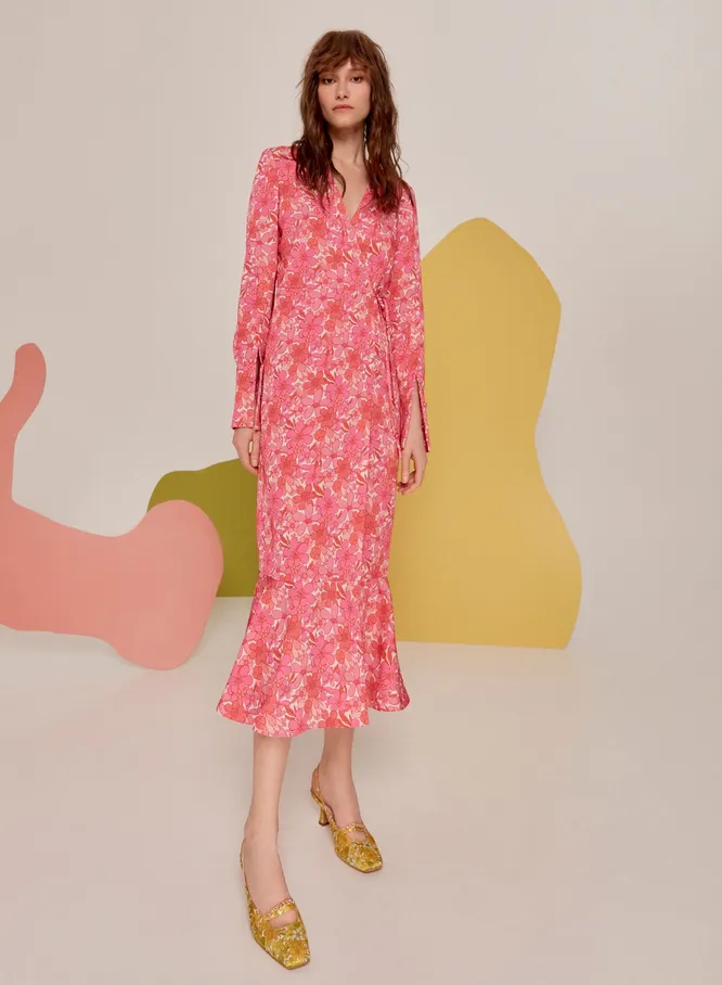 Платье красиво обрамляет фигуру, а цветочный принт, расклешенный подол и разрезы на рукавах придают образу легкую французскую небрежность.
