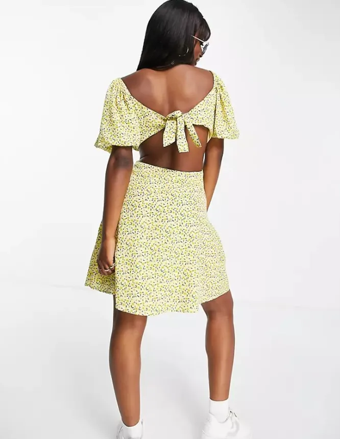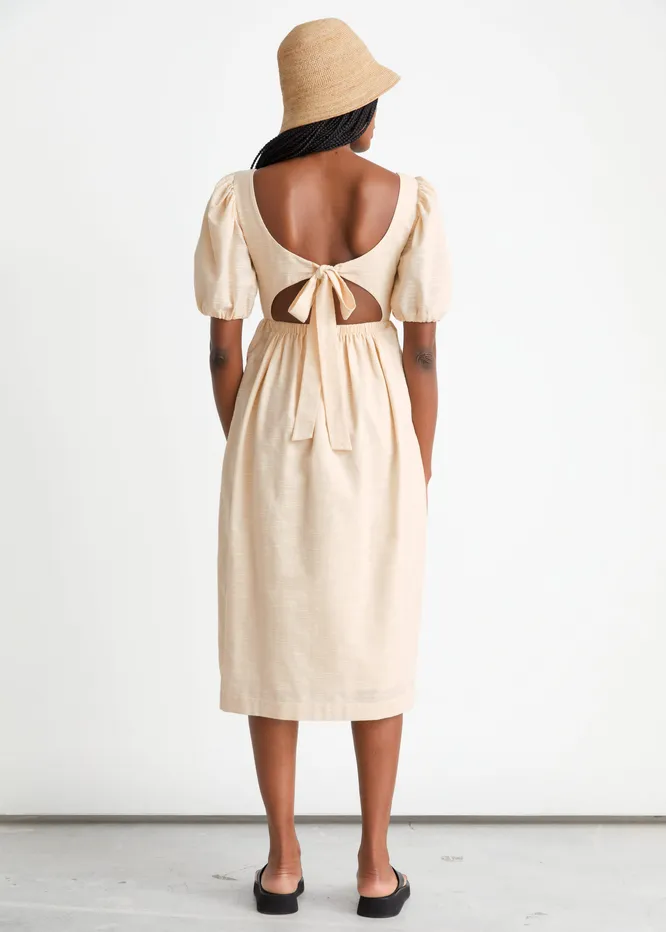 Стильное решение на каждый день — нежное чайное платье с квадратным вырезом на спине. Можно носить его с белыми кедами или яркими мюли.