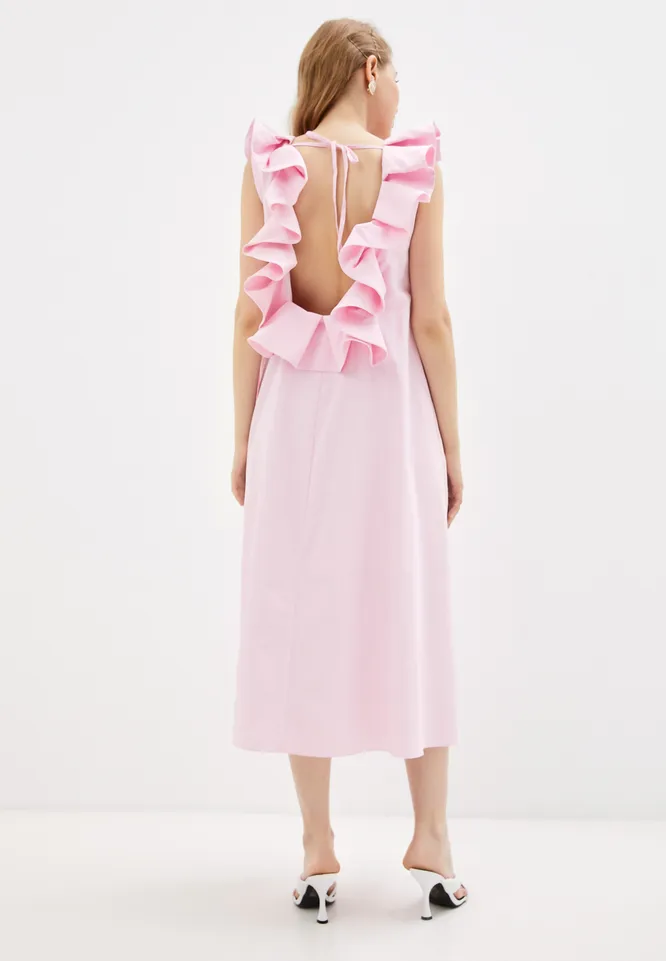 Если ищешь наряд для торжества (например, свадьбы друзей), обрати внимание на нежно-розовое платье с акцентными воланами.