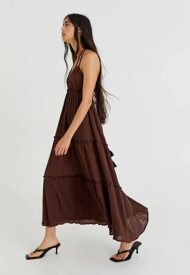 Ярусное платье макси идеально подойдет как для города, так и для пляжа. Можно носить его с шлепанцами на толстой подошве или изящными босоножками на завязках.