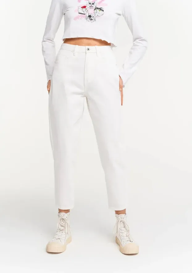 Джинсы-бананы отлично смотрятся с фактурными блузами, декорированными объемными рукавами, воланами, рюшами или бантами. Их также можно носить с базовыми футболками и укороченными топами, строгими рубашками и кокетливым кардиганами. Из обуви выбирай кроссовки или кеды на толстой подошве, туфли или босоножки на каблуке – они помогут визуально еще больше вытянуть ноги и рост.